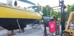 Au bout d’une semaine on est prêts à retourner à l’eau et rendez-vous est pris avec Tony pour le vendredi matin (Vendredi Saint normalement férié mais Tony accepte de nous mettre à l’eau avant midi). La veille, je mets le nez dans le moteur pour essayer d’éclaircir cette histoire de démarreur. Il ne veut rien savoir. Le relais claque mais le démarreur ne tourne pas. Je passe la soirée sur des forums internet pour essayer de comprendre. Le matin je refais des essais, notamment celui de shunter avec un tournevis les bornes de puissance du relais. Et là le moteur démarre ! Dans ma précipitation pour l’arrêter puisque on est au sec et qu’il n’y a pas d’eau de refroidissement, je tourne bêtement la clé de contact sur off, ce qui a pour effet de désactiver le bouton poussoir qui sert normalement à arrêter le moteur. J’ai beau pousser sur le bouton, le moteur ne s’arrête pas. Panique!…J’appelle au secours Tony (très compétent en mécanique) qui malheureusement ne se trouve pas à proximité. A force d’entendre mes hurlements qui alertent tout le chantier, Tony finit par arriver, trouve en quelques secondes le petit levier qui coupe le gazole et le moteur s’arrête avant d’avoir eu le temps de trop chauffer. Ouf !…